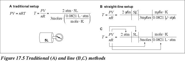 Example 1: What is the approximate temperature of 3 moles of nitrogen gas contained in a 5-liter flask at 20 atmospheres (R=0.0821 L atm/mol K)? The traditional method requires that the universal gas constant, R, be placed as a fraction in the denominator (figure 17.5A). By contrast, the line method requires that the universal gas constant, R, be inverted and multiplied so that there are no fractions in the numerator or denominator (figure 17.5B). It is now easier to see how units cancel (figure 17.5C).