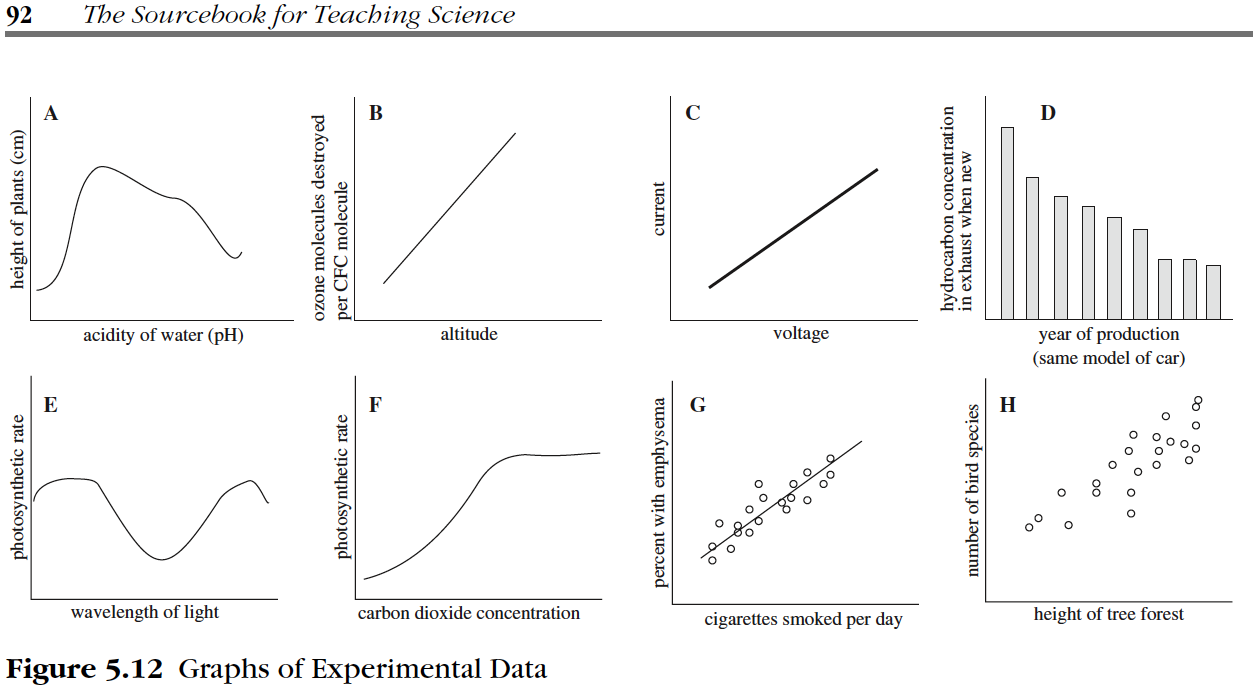 Figures 5.12A-5.12H show the data from a variety of experiments and studies. For each of graph, identify (1) the independent variable, (2) the dependent variable, (3) list things that must be held constant, (4) describe an experiment that would produce such data and (5) give a simple interpretation of the data.