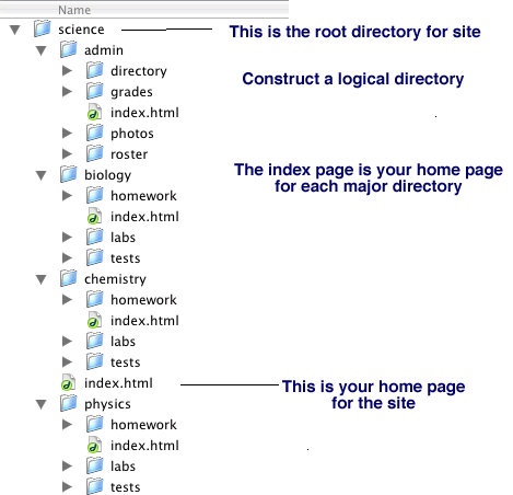 Directory Structure: It is important that you organize all documents for your web site in a logical file structure on your local computer. All documents for your web site must be contained in a single folder (directory) that contains logical sub-folders (sub-directories).