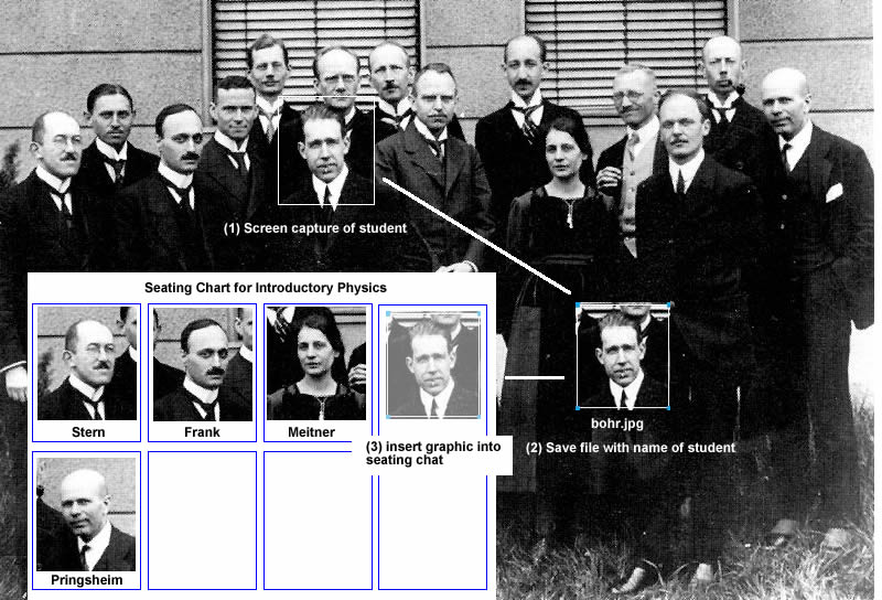 When creating a photographic seating chart, it is fastest to take a picture of groups of students and then use a screen capture to extract photos of individual students as shown in the diagram below.